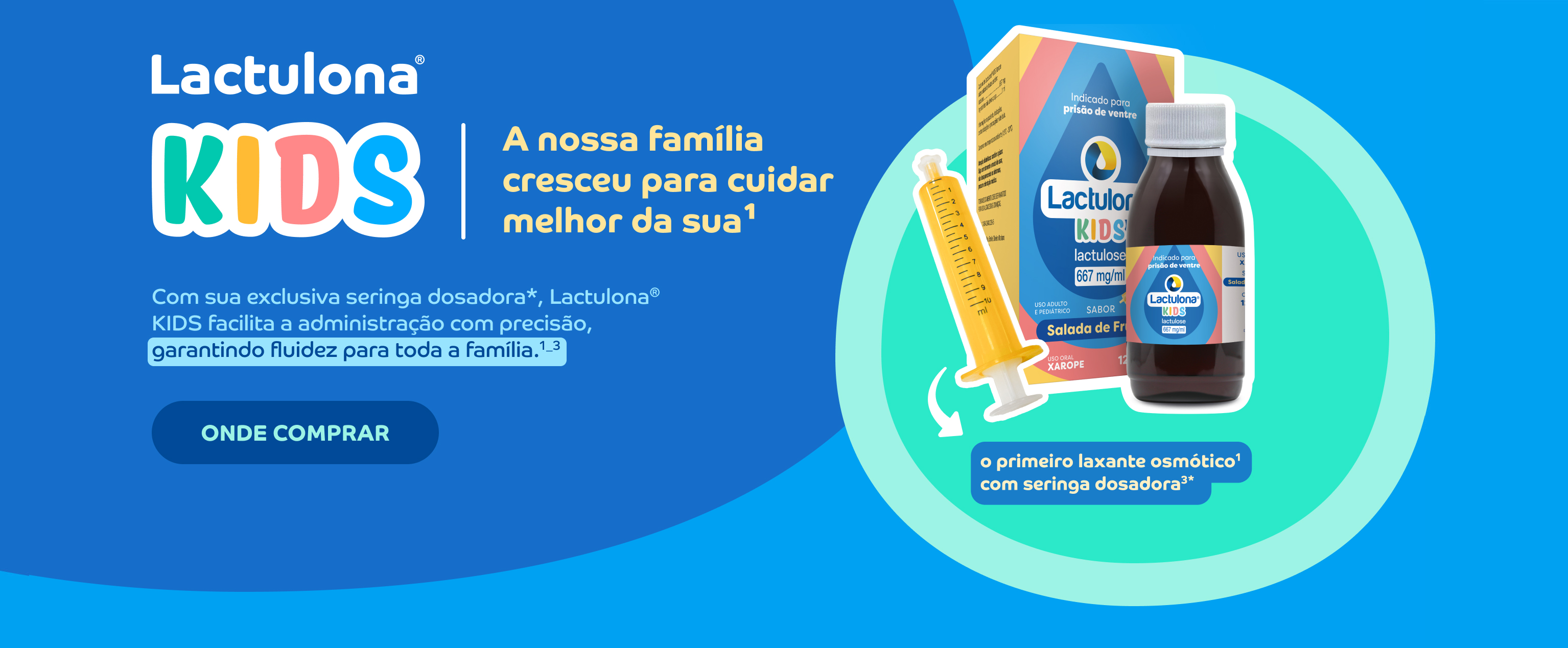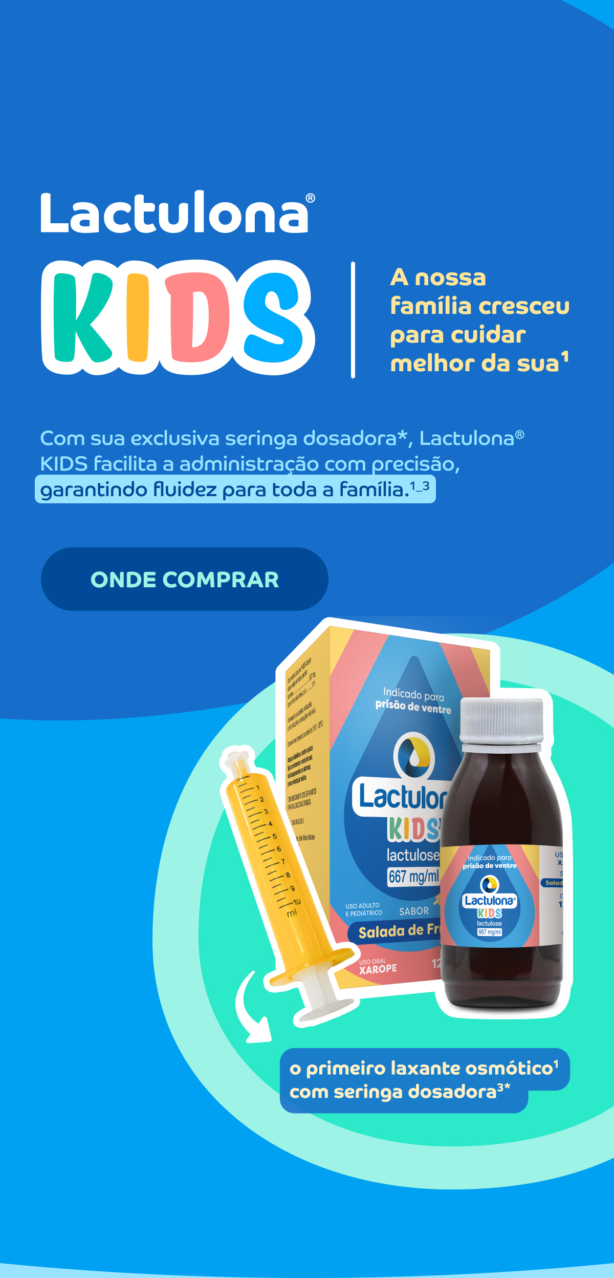 * Primeiro medicamento de princípio ativo lactulose com seringa dosadora. ** Comparado com o composto a base de senna. # Quando comparado com placebo. *** A DSBR disponibiliza os links de acesso a algumas drogarias para mera conveniência do consumidor e as opções disponibilizadas não são as únicas existentes no mercado. O consumidor tem total liberdade para adquirir Lactulona® Kids em qualquer outra drogaria de sua preferência. **** Verifique a disponibilidade de entrega em sua região. Operação, venda, entrega e tecnologia são de responsabilidade da drogaria. Se você deseja reportar um evento adverso, queixa técnica ou necessita de informações sobre o produto Lactulona®, por favor, contate o seu médico e fale conosco: SAC Daiichi Sankyo Brasil.